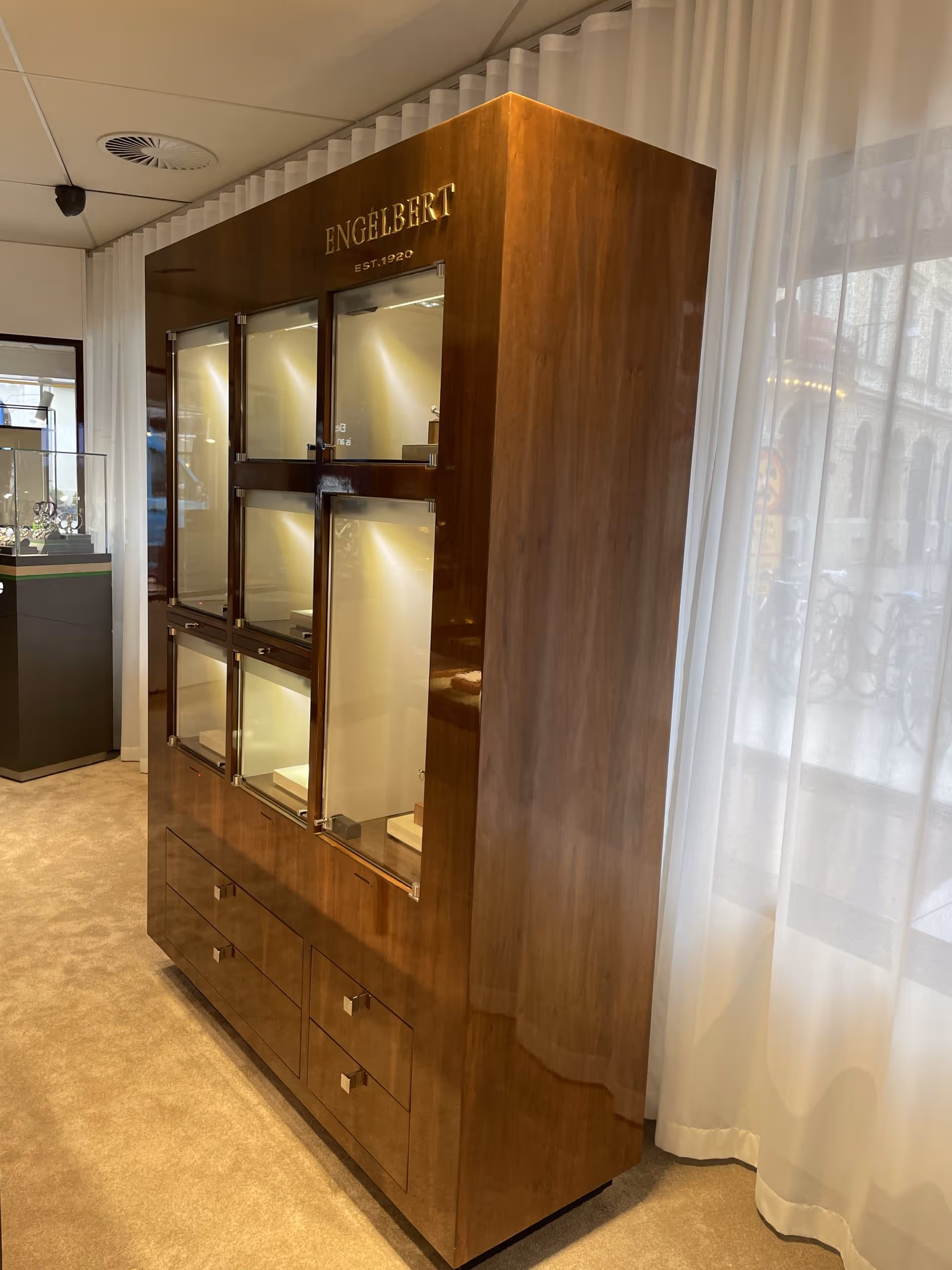 Vi har skapat exklusiv inredning till Jarl Sandin Watches & Jewellerys butik i Göteborg. Den nya inredningen utmärker sig med detaljer i högblank mahogny. Uppdraget har inneburit arbete i pågående verksamhet, med hög precision och anpassning för att minimera störningar.