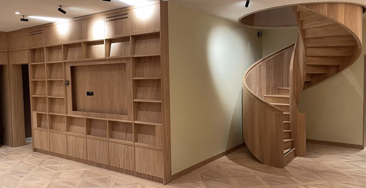 I den unika kulturmärkta byggnaden Vasa 12, från 1907, har vi skapat inredning som kombinerar modern funktionalitet med respekt för historiska detaljer. Vårt arbete omfattade bland annat en trappa i massiv ek och väggfasta hyllor.